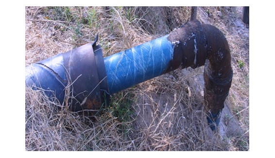 2、燃油输油管道弯头裂纹修复,采用高强环氧修补剂、环氧树脂、碳纤维布复合维修补强,保证管道正常运转,避免损失。